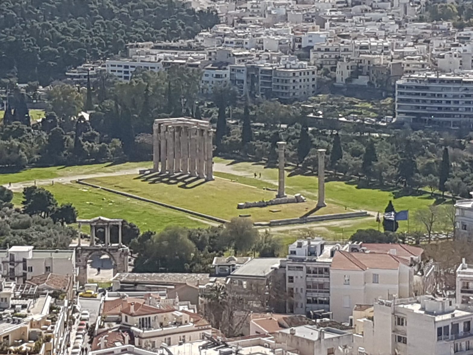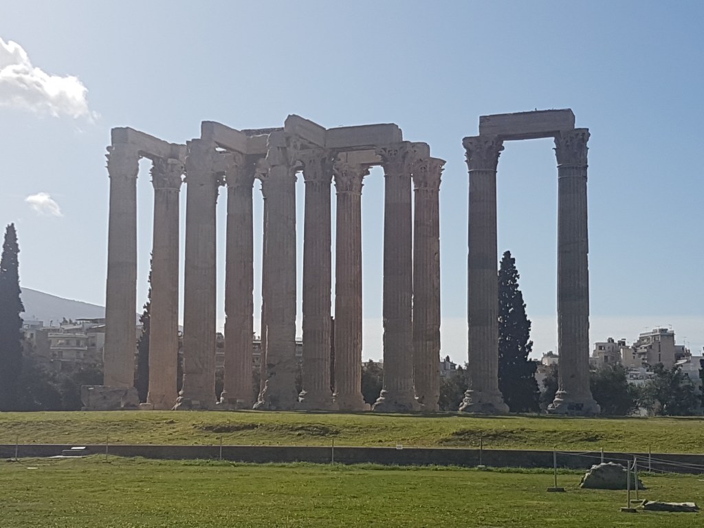 שרידי המקדש שהיה הגדול ביותר ואחד מהחשובים שביוון נמצאים דרומית מזרחית לגבעת האקרופוליס באתונה. מקדש זאוס האולימפי עלה בגודלו על הפרתנון ובנייתו החלה במאה השישית לפני הספירה, במהלך השנים ניסו מספר מנהיגים לסיים את בנייתו אך רק כעבור 650 שנים הצליח לסיים את בנייתו הקיסר הרומי אדריאנוס אשר הקדיש את המקדש לזאוס. הקיסר דאג להציב במקדש פסל של זאוס המשובץ זהב ושנהב ולצידו באופן "צנוע" הציב גם פסל של עצמו בגודל זהה לפסלו של זאוס.