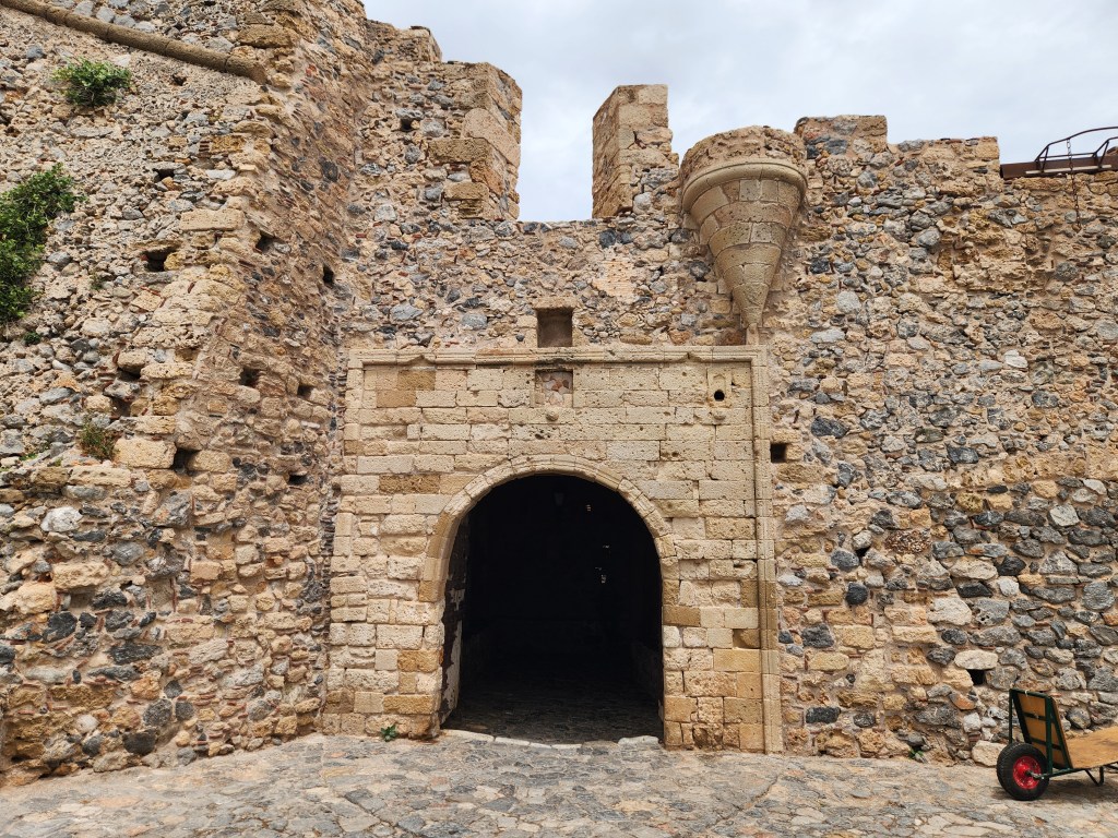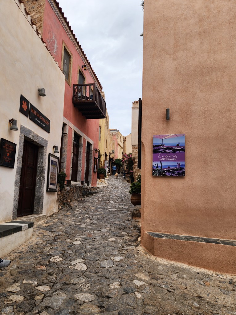 היא אחת מהעיירות העתיקות המפורסמות בדרום יוון – הפלופונס, ושוכנת על סלע בגובה של 300 מטר. פירוש שמה הוא "כניסה יחידה" (ביוונית: Moni – יחיד, ו-Emvasi – כניסה = "כניסה יחידה") ואכן לעיירה כניסה אחת אליה מובילה רצועת יבשה צרה שלאורכה גם חונים המבקרים ברי המזל שמצאו חנייה קרובה לכניסה. (מגרש חניה גדול ממוקם בתחילת הכביש המוביל אליה ממנו ניתן להגיע רגלית לכניסה לעיר או בעזרת אוטובוס מקומי בתשלום).